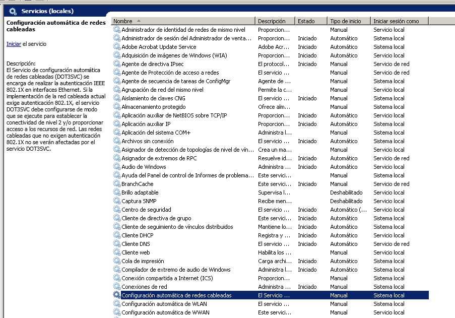 Para que los clientes Windows puedan autenticarse y conectarse a la red, primero deberemos habilitar el servicio de “Configuración automática de redes cableadas” : El Servicio de configuración automática de redes cableadas (DOT3SVC) se encarga de realizar la autenticación IEEE 802.1X en interfaces Ethernet. Si la implementación de la red cableada actual exige autenticación 802.1X, el servicio DOT3SVC debe configurarse de modo que se ejecute para establecer la conectividad de nivel 2 y/o proporcionar acceso a los recursos de red. Las redes cableadas que no exigen autenticación 802.1X no se verán afectadas por el servicio DOT3SVC.